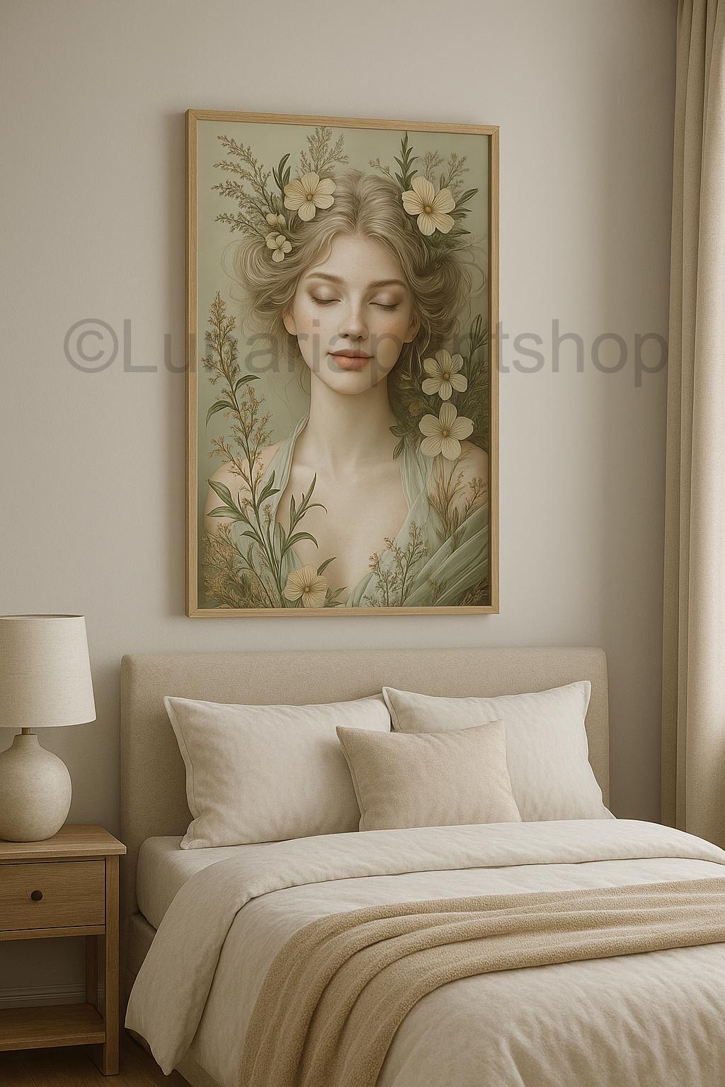 Immerse your space in the soft serenity of Flora Reverie, a fine art portrait that celebrates feminine beauty and the harmony of nature. This dreamy digital print features a delicate young woman with closed eyes, surrounded by wildflowers and earthy greenery in an ethereal, painterly style. The muted natural tones and botanical details evoke a sense of calm, making it the perfect centerpiece for a bedroom, studio, or any nature-inspired interior. Product Details: • High-resolution digital download • Sizes included: 8x10”, 11x14”, 16x20” (or customized upon request) • Ideal for gallery walls, boho decor, or modern romantic interiors • Instant download — no physical item will be shippe